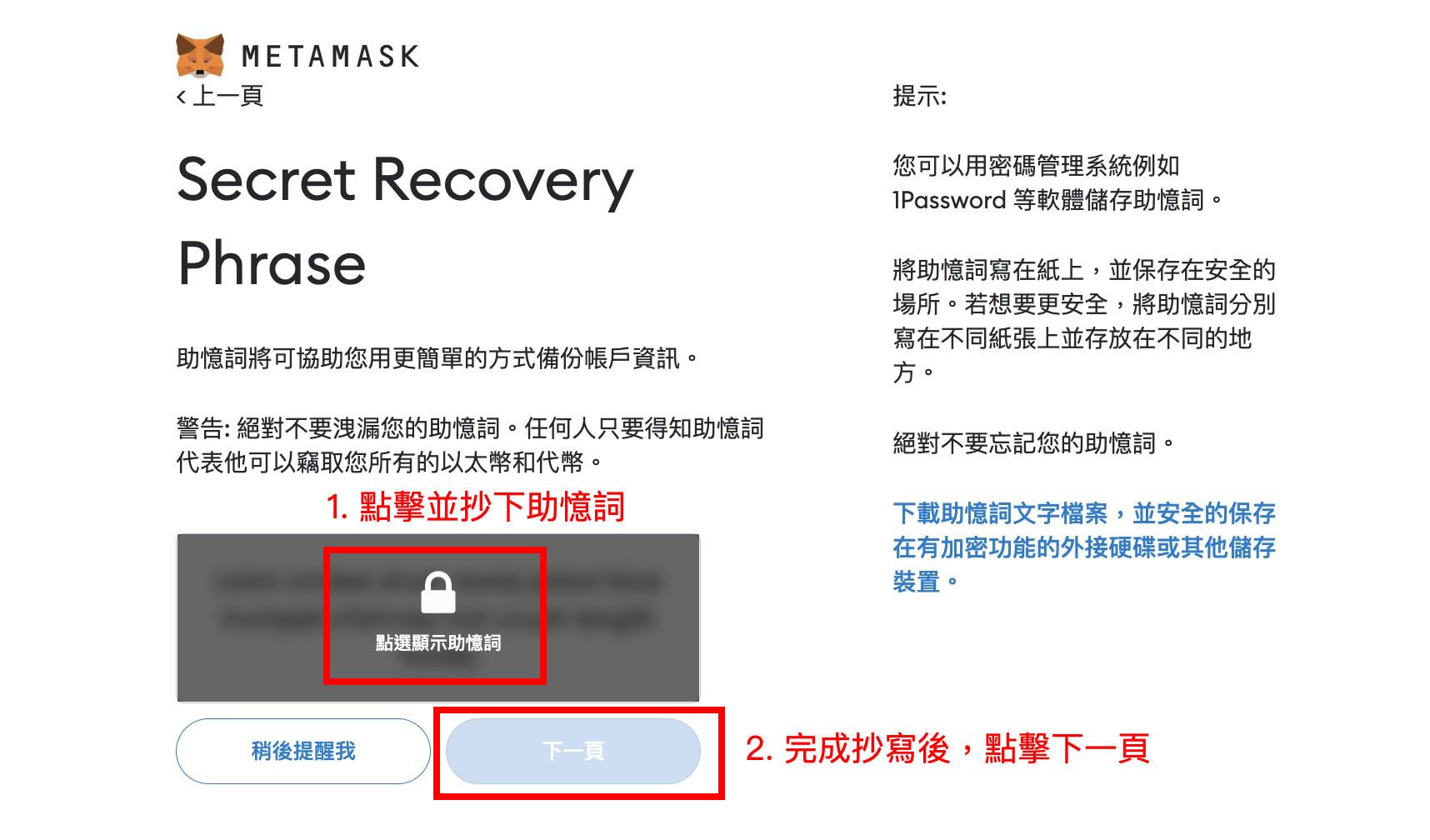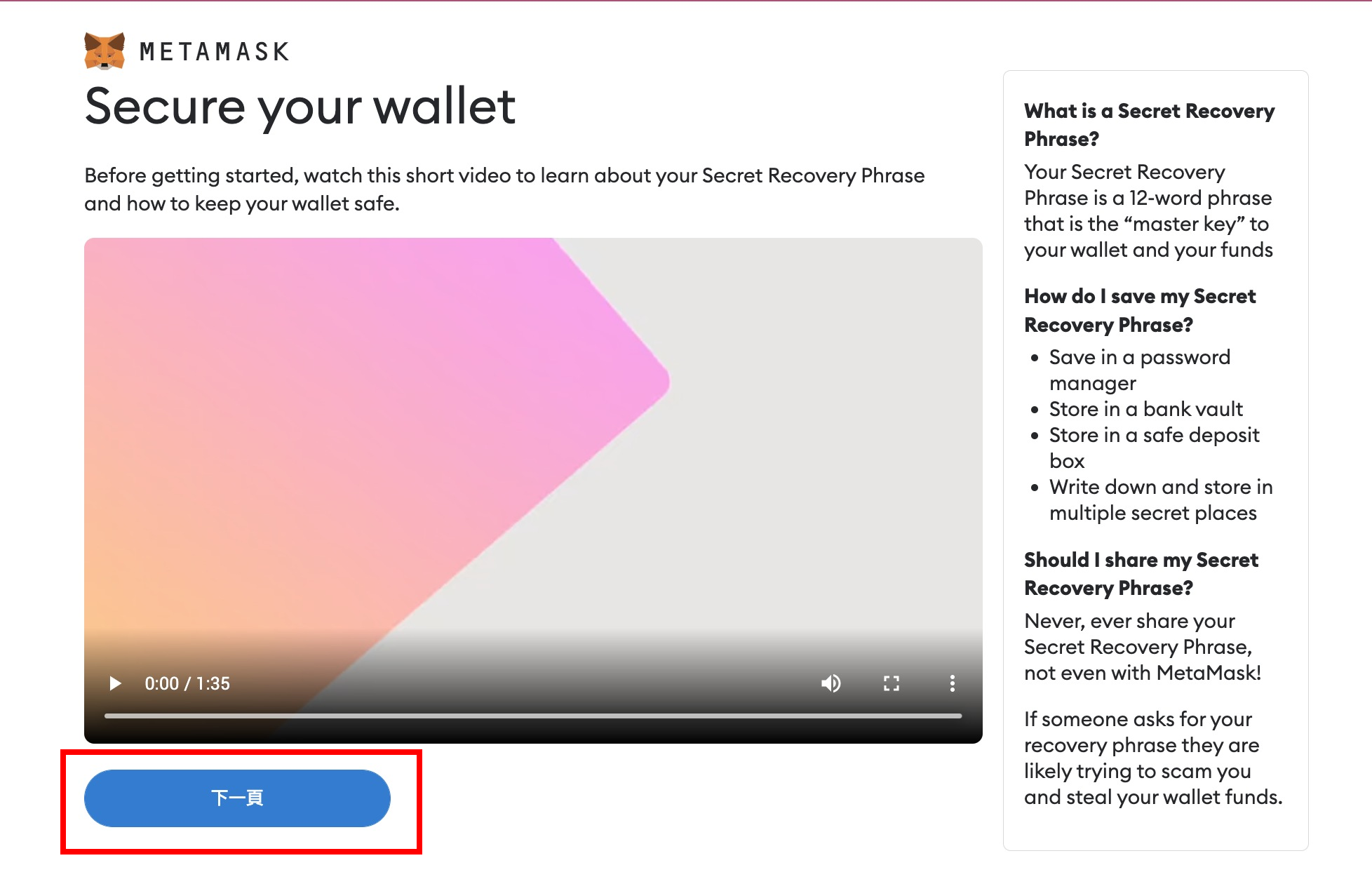 1. 顯示 Secret Recovery Phase 說明,可直接點擊 「 下一頁 」。(下一頁將有中文說明)