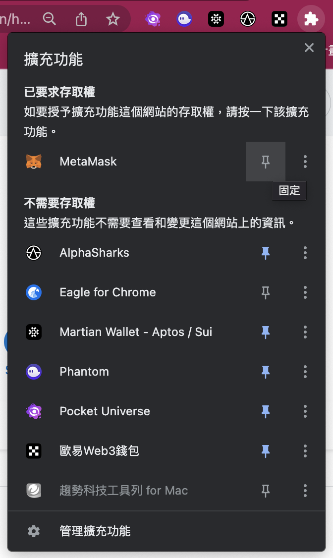 您可以將 MetaMask 插件釘選在右上角的拼圖中,以便未來使用。