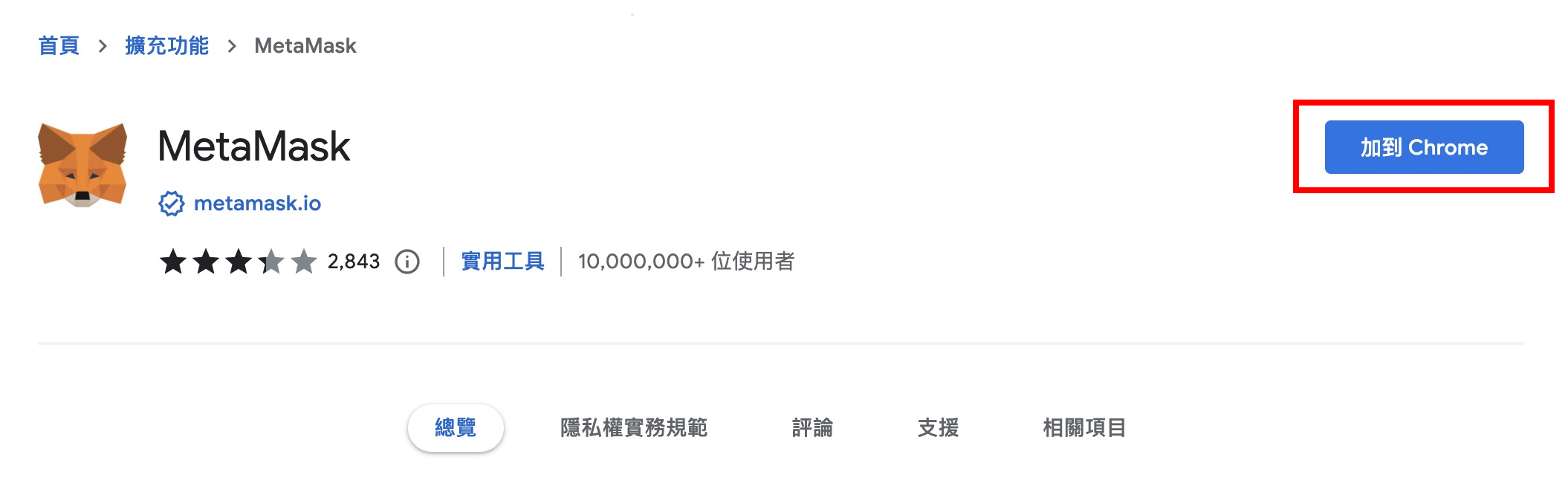 1. 前往 Chrome 線上應用程式商店,點擊 「 加到 Chrome 」,將 MetaMask 安裝至瀏覽器。