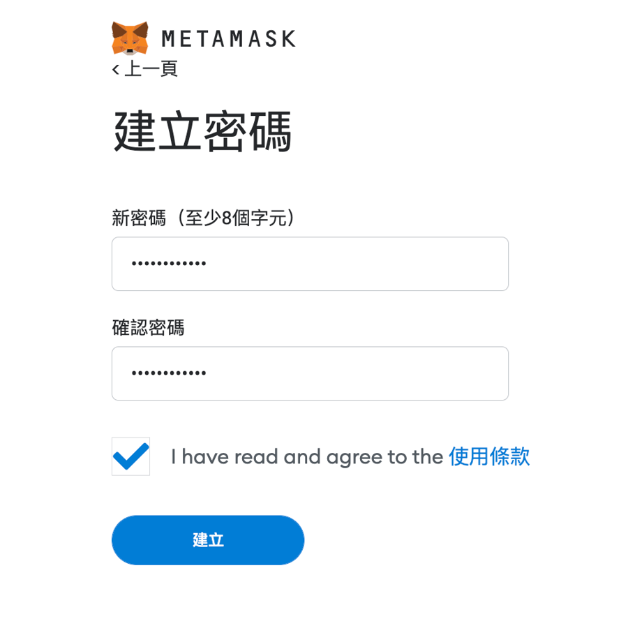 3. 建立密碼,並勾選 「 我已閱讀並同意使用條款 」 後,點擊 「 建立 」。