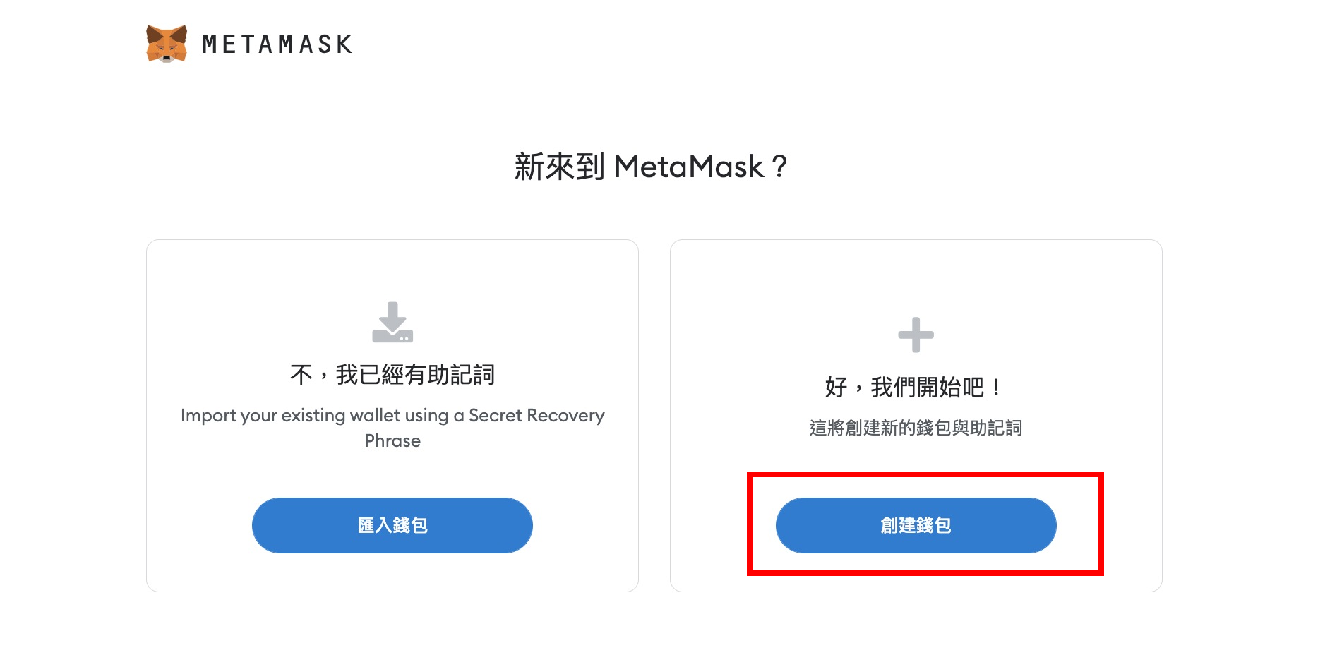若您已持有 MetaMask 錢包,請選擇左邊的「匯入錢包」,輸入 12 個助憶詞。